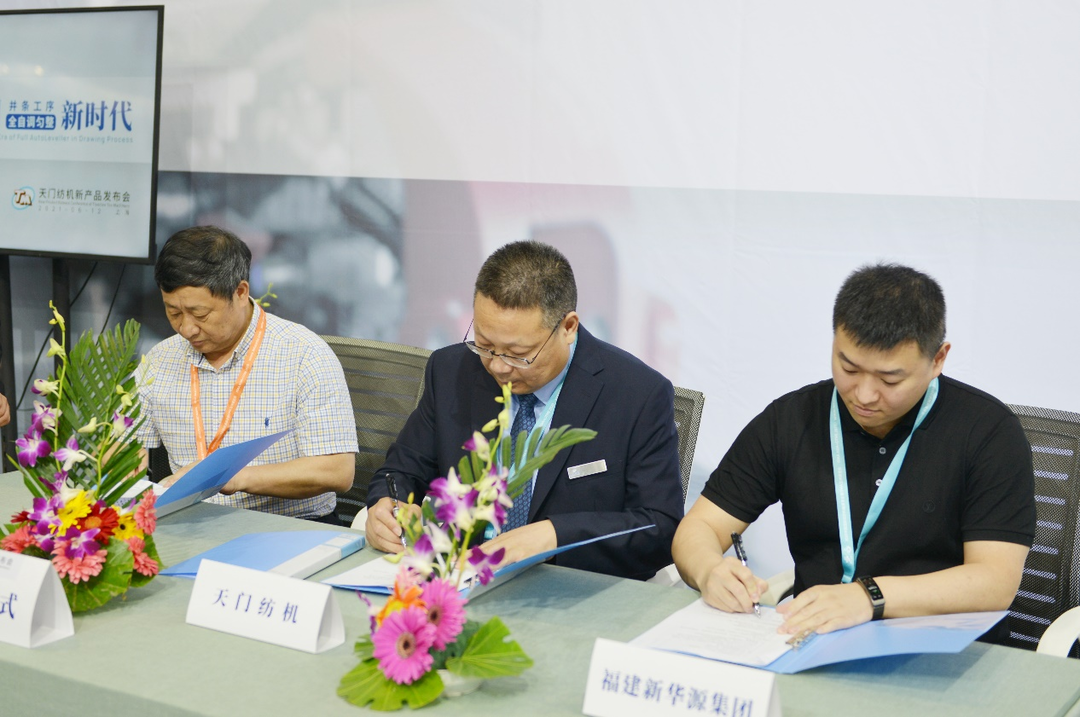 發布會上,TM15、TM19首批客戶福建新華源紡織集團有限公司、湖北妙虎紡織有限責任公司等紡企,與天門紡機現場簽訂戰略合作協議,將在“并條工序全自調勻整”深度合作、攜手共進。