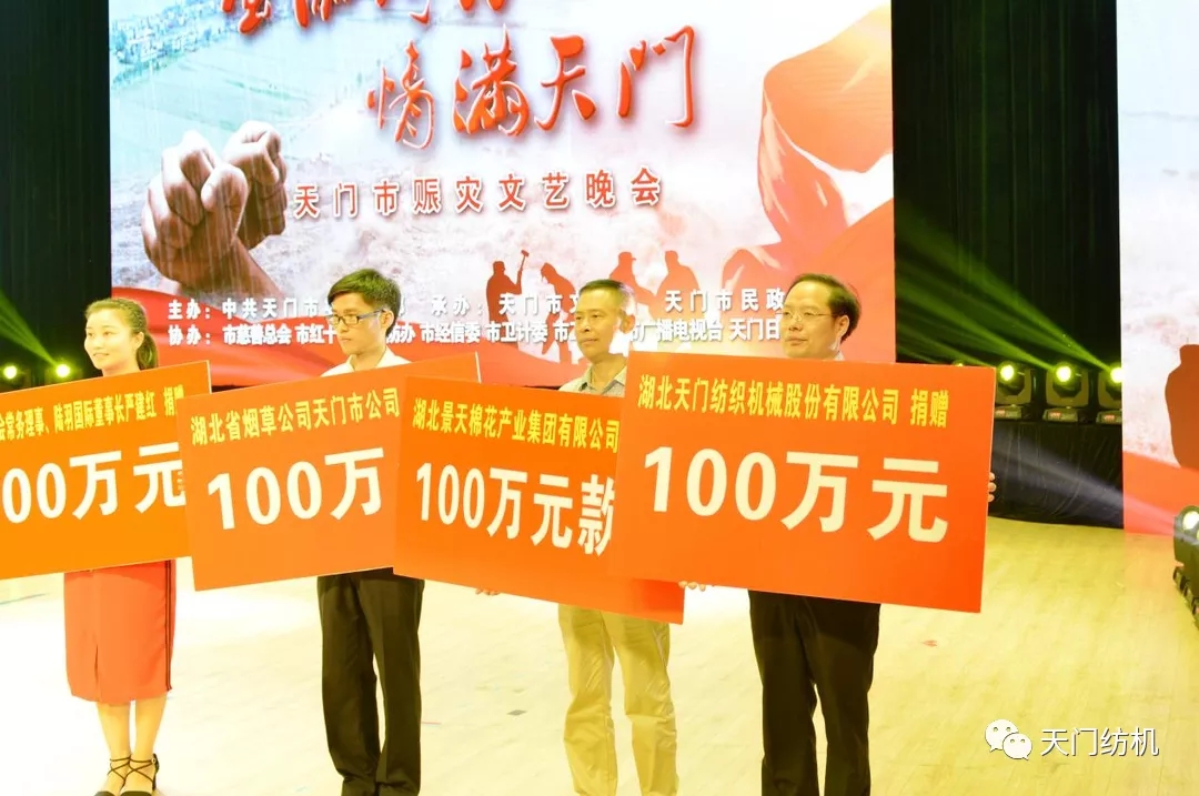 2016年,天門全市遭遇百年一遇的特大洪澇災害,人民生命財產受到嚴重威脅。天門紡機積極參與政府組織的抗洪救災慰問活動,為奮戰在一線的防汛抗災人員送去食品、藥品和救災物資,并捐贈100萬元抗洪救災款。