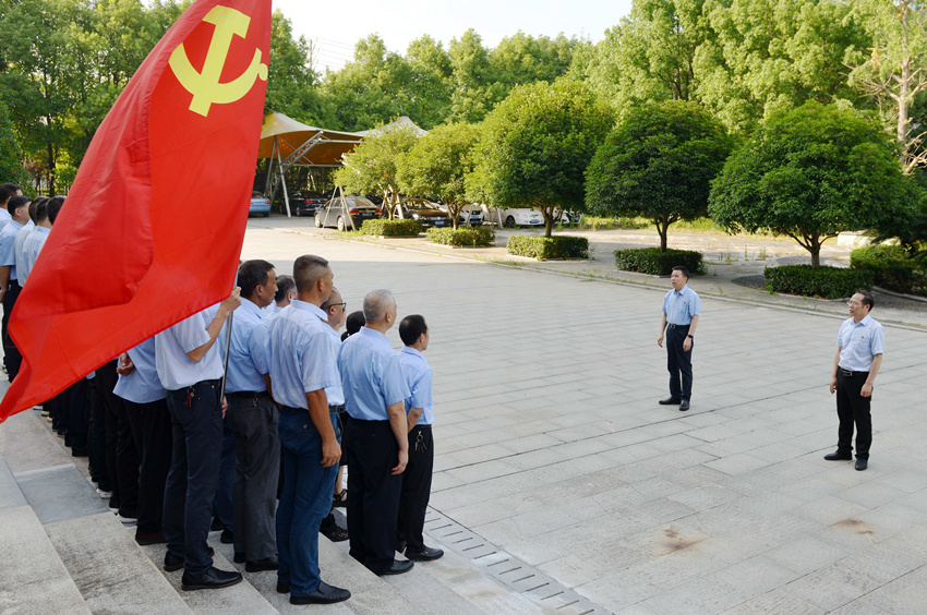 全國人大代表、天門紡機董事長沈方勇在黨員隊伍集結時激情致辭。他說,中國共產黨在嘉興南湖一艘紅船上誕生,從50多名黨員發展成為9000多萬名黨員的世界第一大執政黨。百年來,中國共產黨書寫了一部堅守初心使命、應對危局困境、經受風險考驗、戰勝困難挫折、開創民族復興偉業的奮斗史。作為一名共產黨員和天門紡機員工,我們要牢記黨的奮斗史,永葆青春活力,做先鋒模范,起戰斗堡壘作用,為企業發展、為建設富強民主和諧美麗社會主義現代化強國貢獻應有的力量。