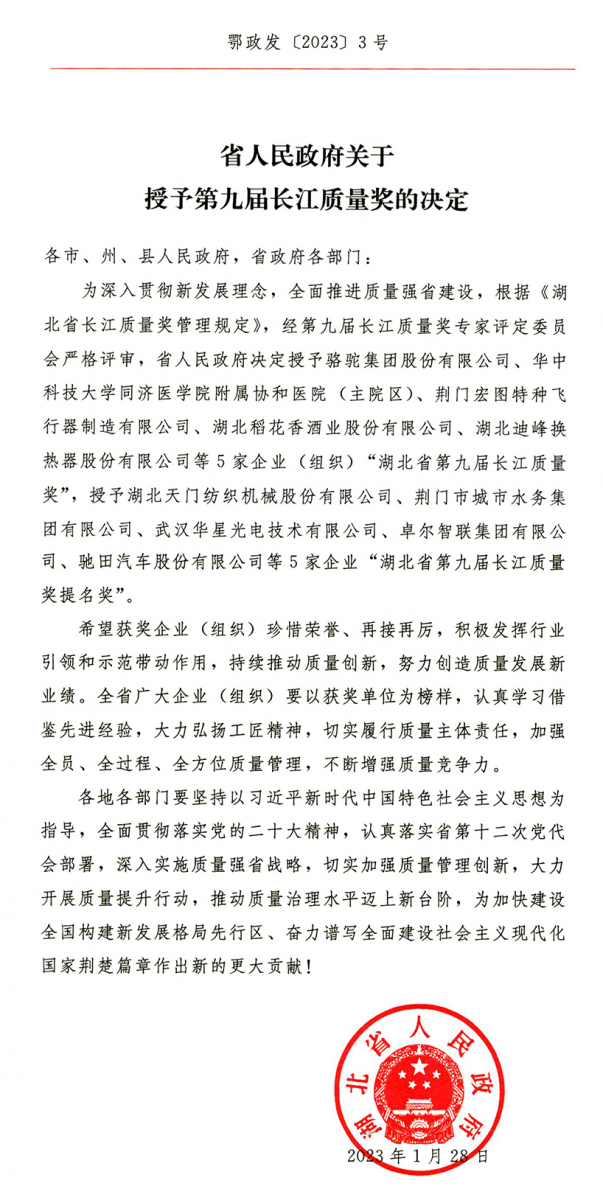 近日,湖北省人民政府以鄂政發(2023)3號文頒發《關于授予第九屆長江質量獎的決定》。天門紡機榮獲“湖北省第九屆長江質量獎提名獎”,受到省政府表彰。
