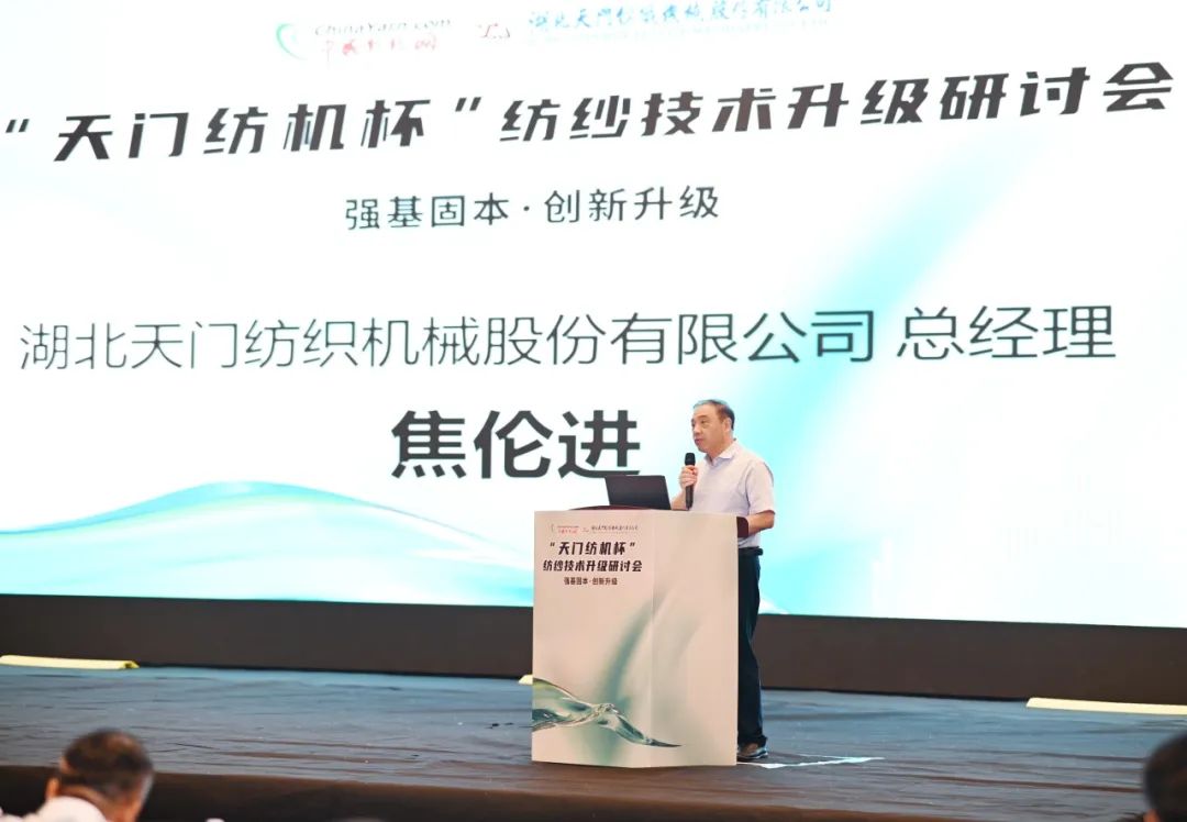 天門紡機總經理焦倫進向蒞臨會議的領導、嘉賓及長期關心支持天門紡機發展的各界同仁朋友表達了誠摯的謝意,他表示,天門紡機“生產制造柔性化、倉儲物流自動化、信息管理現代化”的5G+智慧工廠項目正在不斷向前推進,我們將通過自身的數字化轉型與智能化改造,為紡織企業數字化轉型和智能化改造持續提供裝備基礎。并作了題為《并條機的創新與應用助力紡企高質量發展》的專題報告。他交流了天門紡機堅定不移走“專精特新”之路的工作經驗,分享了勻整控制、在線監控、5G+物聯網、自動熱交換降溫系統等技術創新成果。