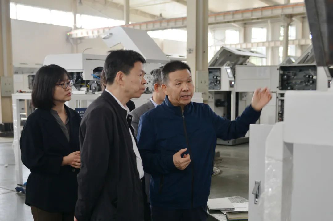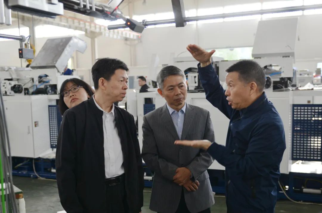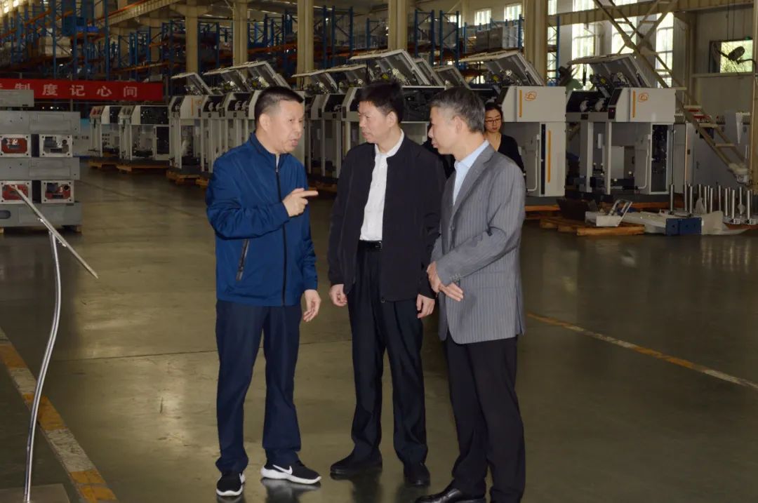 在車間現場,沈方勇董事長向單院長一行介紹了天門紡機目前的生產經營狀況、智慧工廠項目建設進展以及近年來科技開發取得的成績;詳細介紹了正在調試并即將赴上海參展的多臺全新樣機的情況。