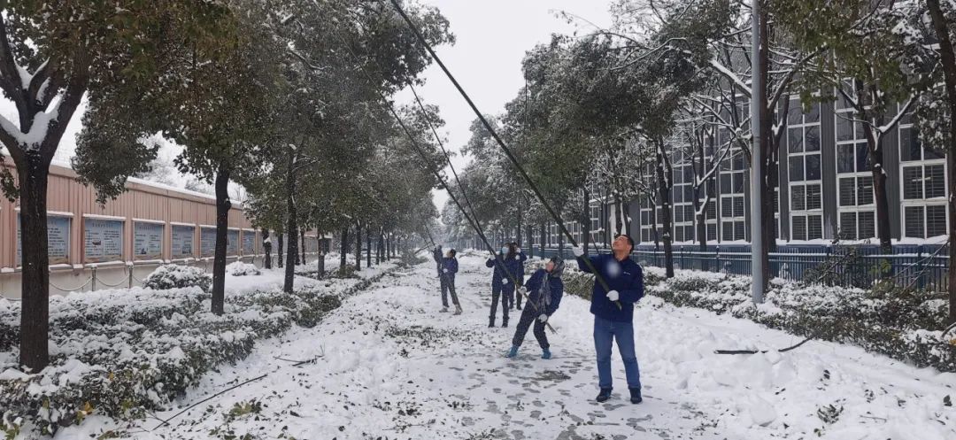清晨的氣溫在零下4度左右,寒意刺骨。但大家不懼嚴寒,手握鐵鍬,高舉竹竿,竭盡全力清除積雪。