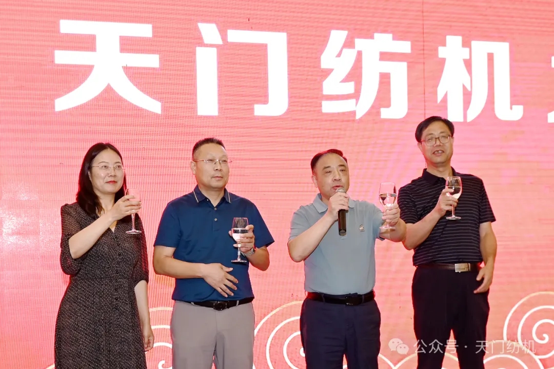 陜西省紡織科學研究院有限公司黨委書記、總經理徐遠志,天門紡機總經理焦倫進,天門紡機副總經理肖少華,《棉紡織技術》期刊社副總經理冉軍麗答謝晚宴共同祝酒