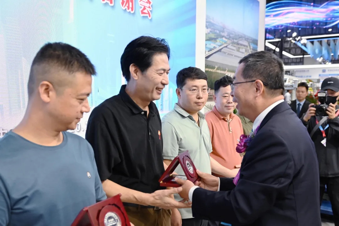 天門紡機總經理焦倫進宣布在協同創新中作出突出貢獻的單位和個人名單,中國紡織工業聯合會徐迎新副會長為倪俊龍董事長、陳冰教授、曹中華博士、陸惠文先生頒發紀念章,為臺達、匯川、南通五洲等3家企業代表頒發紀念牌。