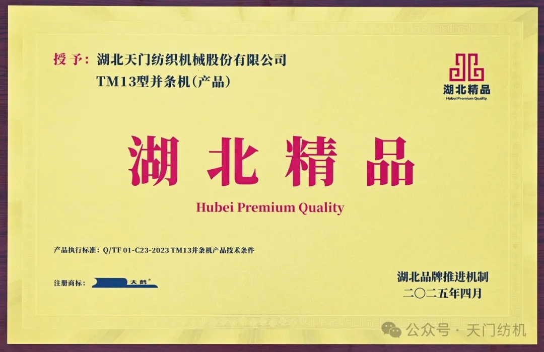 為貫徹落實《湖北省質量強省建設綱要》《建設品牌湖北推動高質量發展行動綱要》有關部署,湖北省品牌推進機制辦公室從2023年起,正式啟動了“湖北精品”培育認定工作。其中,第二屆動員了562家經營主體,有643個(項)產品成功入庫培育,最終161 個(項)產品入列“湖北精品”。天門紡機TM13型并條機脫穎而出,傲立榜單。