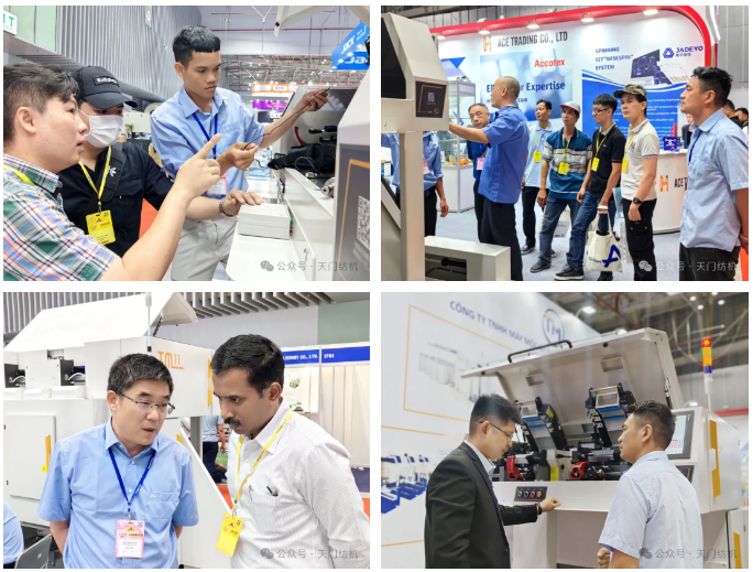 越南展會(huì)現(xiàn)場人流如織,其中天門紡機(jī)展區(qū)尤為矚目,開展期間分別迎來HANO SIMEX、VICOTEX、HONG LINH、NHA TRANG、THANG CONG、PHU BAI等50余家越南紡企的到訪,T1系列并條機(jī)憑借卓越性能表現(xiàn),引發(fā)現(xiàn)場觀眾駐足,多位老客戶對T1系列并條機(jī)的穩(wěn)定性與高效產(chǎn)能給予高度評價(jià)。